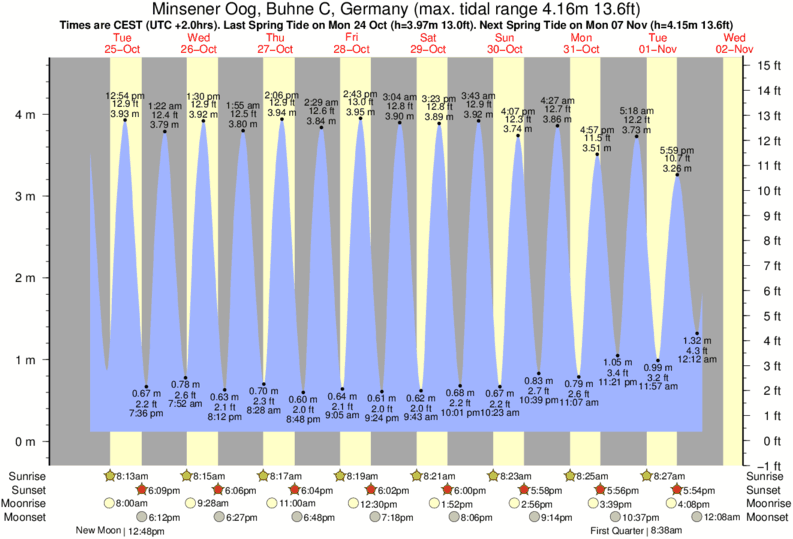 December and January Tide charts for Minsener Oog, Buhne C: The tide charts below show the height, time and date of high and low tides for the next 30 days.