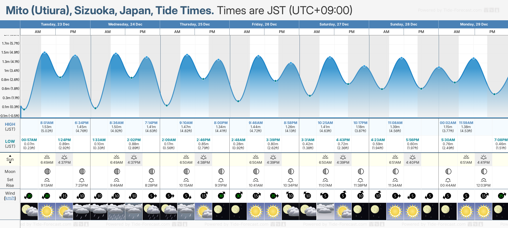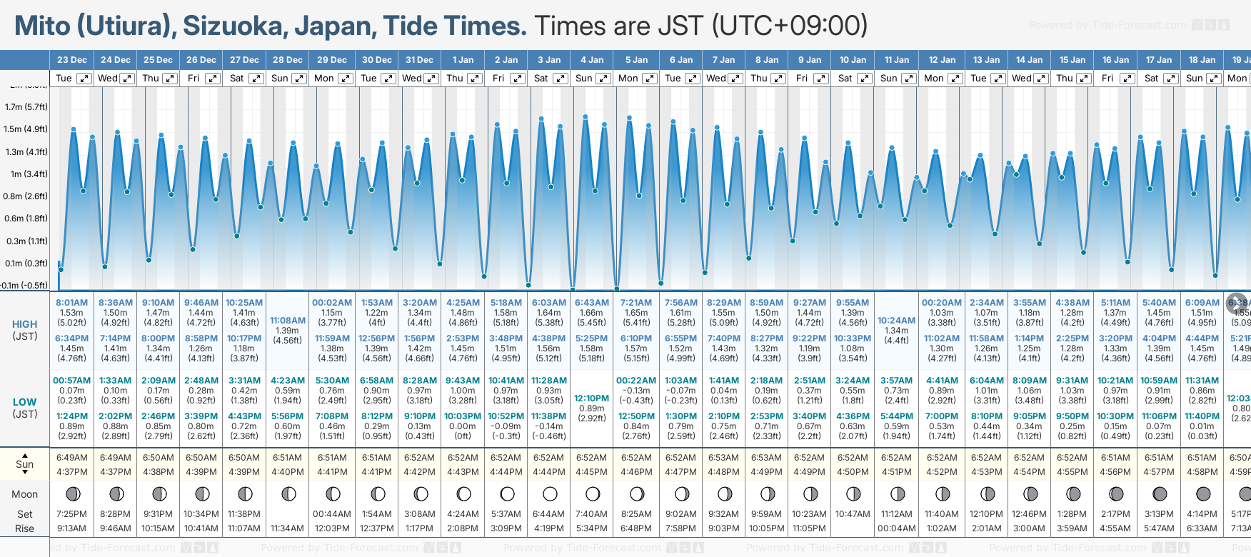December and January Tide charts for Mito (Utiura): The tide charts below show the height, time and date of high and low tides for the next 30 days.