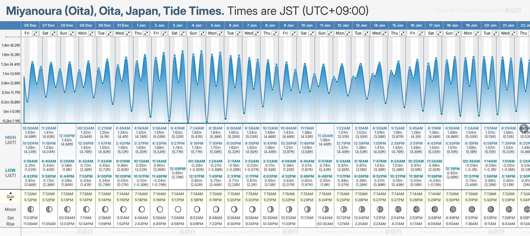 December and January Tide charts for Miyanoura (Oita): The tide charts below show the height, time and date of high and low tides for the next 30 days.