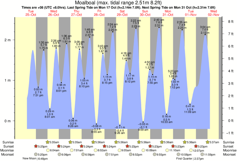 Tide Times are PST (UTC +8.0hrs). Last Spring High Tide at Moalboal was on Mon 08 Dec (height: 2.23m 7.3ft). Next high Spring Tide at Moalboal will be on Wed 24 Dec (height: 2.04m 6.7ft).
