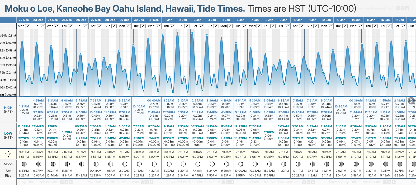 December and January Tide charts for Moku o Loe, Kaneohe Bay Oahu Island: The tide charts below show the height, time and date of high and low tides for the next 30 days.