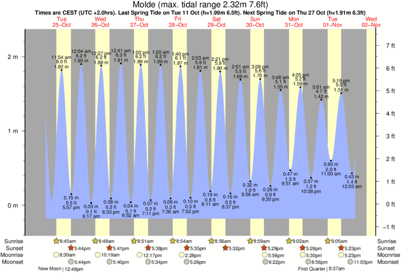 Tide Times are CET (UTC +1.0hrs). Last Spring High Tide at Molde was on Sat 06 Dec (height: 1.98m 6.5ft). Next high Spring Tide at Molde will be on Mon 22 Dec (height: 1.80m 5.9ft).