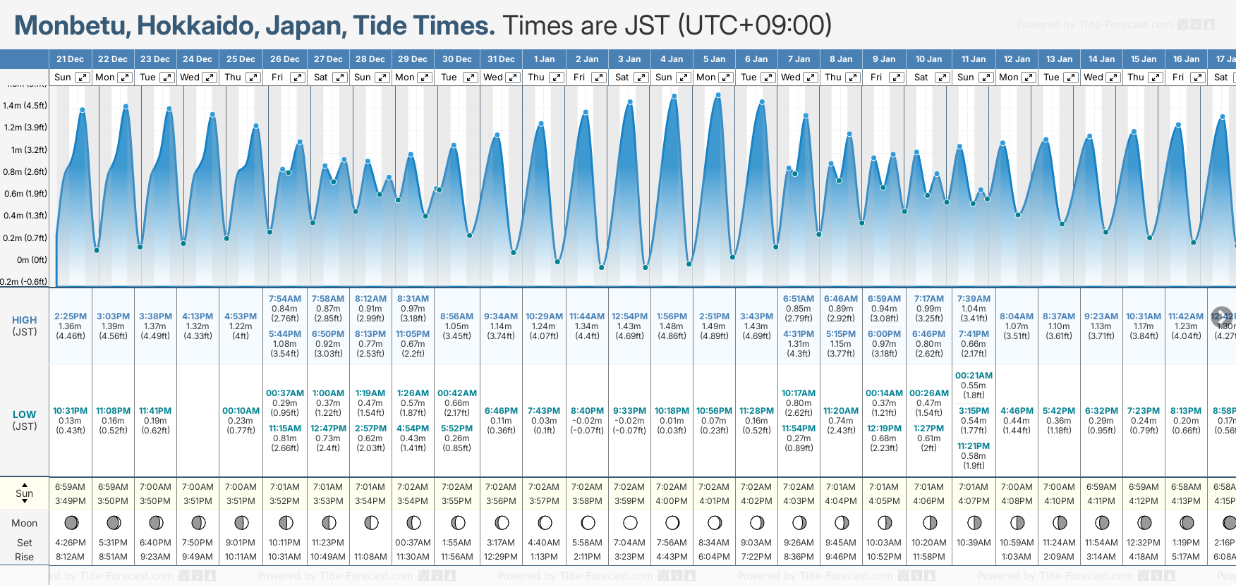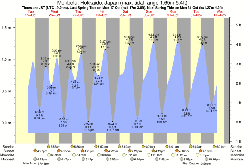 Monbetu tide chart key: The tide chart above shows the height and times of high tide and low tide for Monbetu, Hokkaido, Japan. The grey shading corresponds to nighttime hours between sunset and sunrise at Monbetu.
