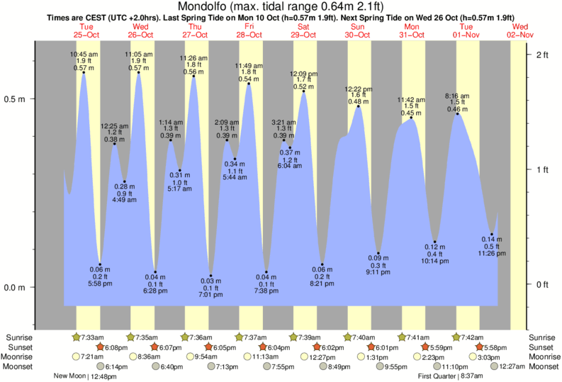 Tide Times are CET (UTC +1.0hrs). Last Spring High Tide at Mondolfo was on Sat 20 Dec (height: 0.51m 1.7ft). Next high Spring Tide at Mondolfo will be on Tue 30 Dec (height: 0.56m 1.8ft).