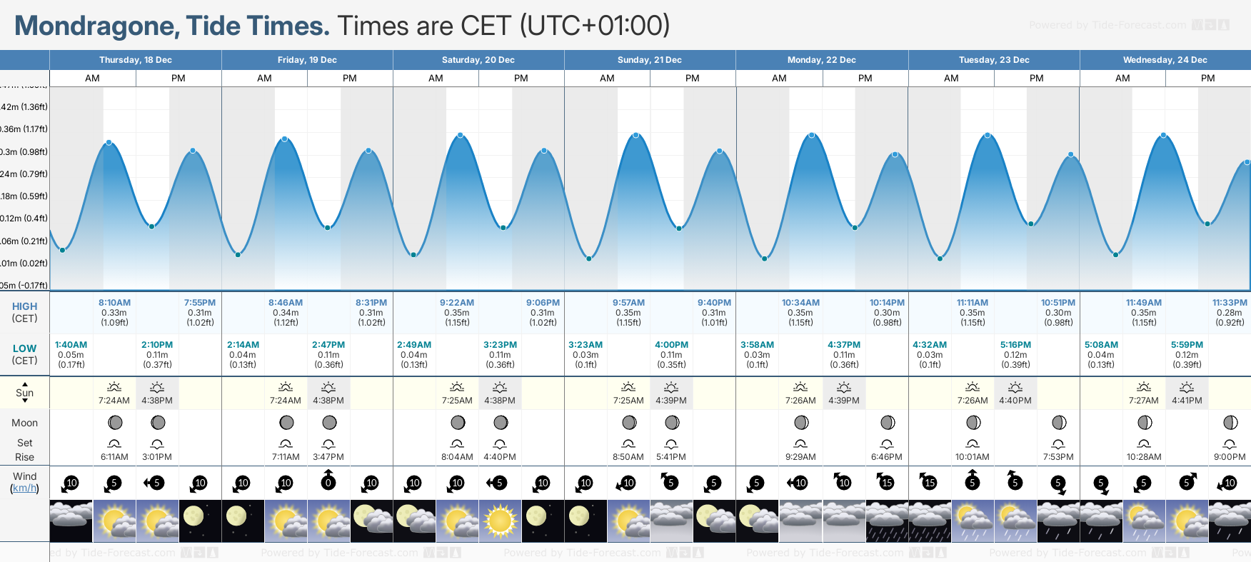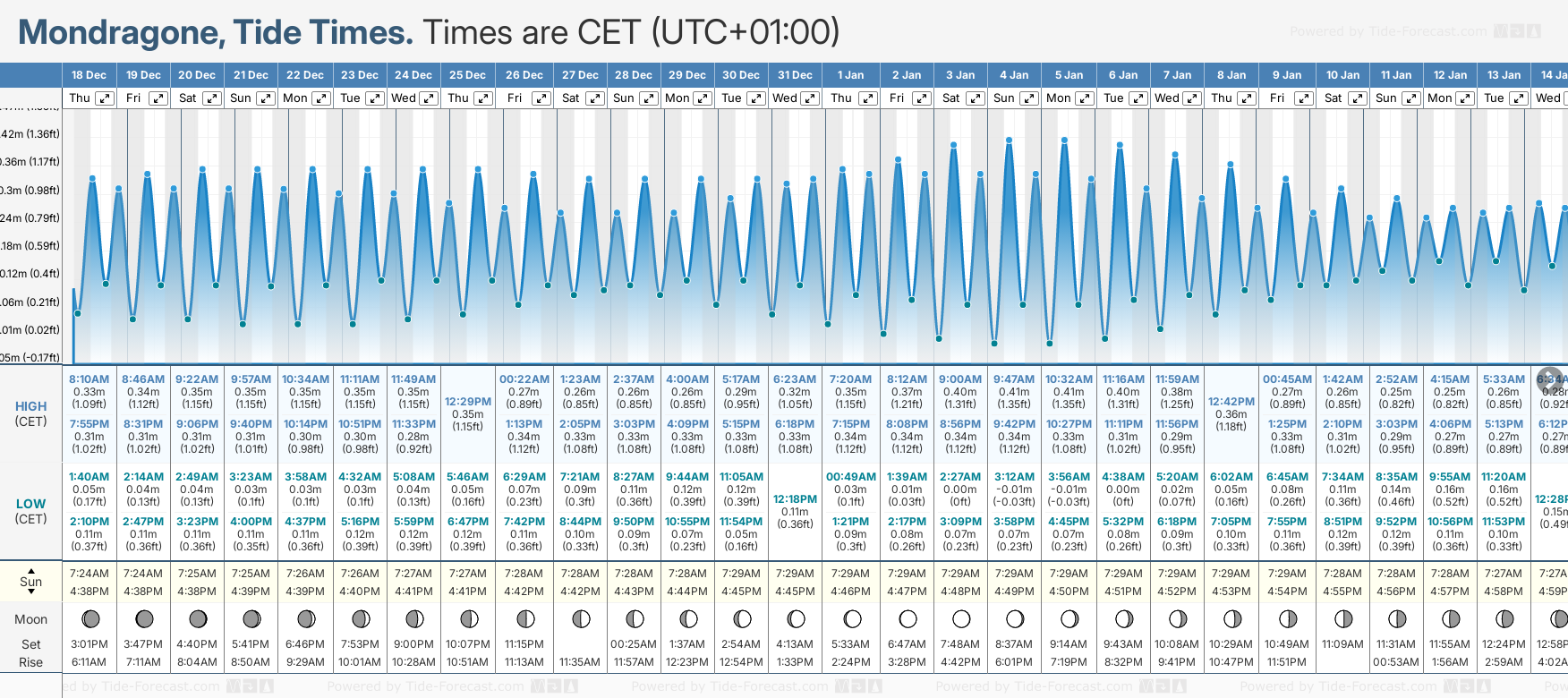 December and January Tide charts for Mondragone: The tide charts below show the height, time and date of high and low tides for the next 30 days.