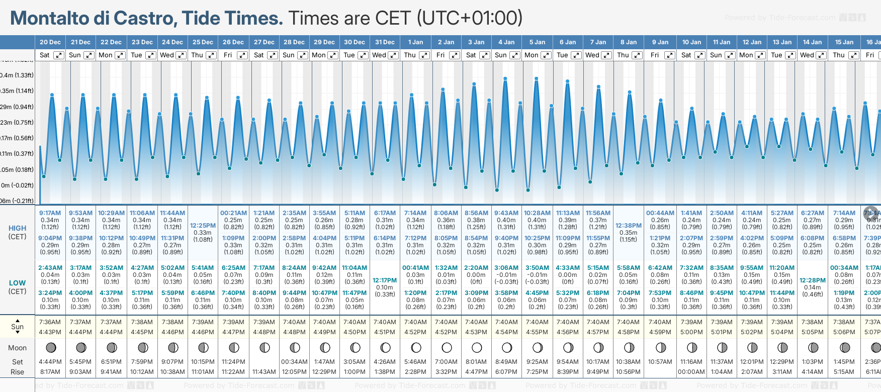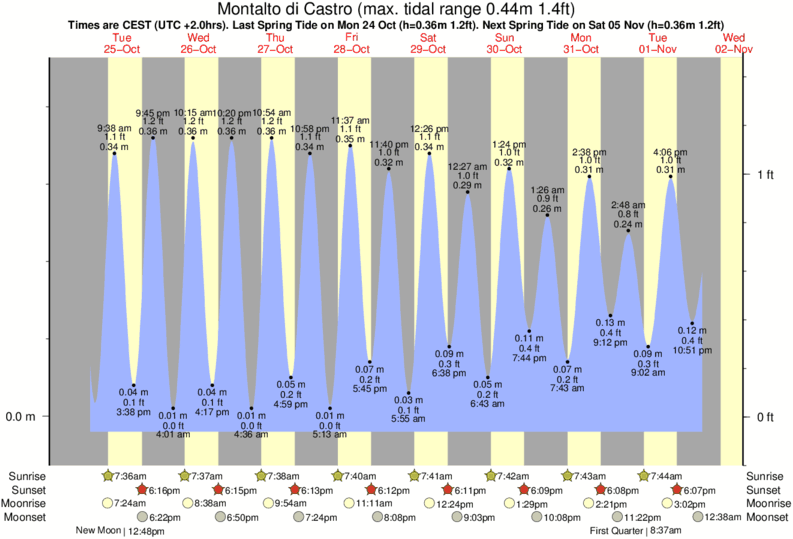 Tide chart for Montalto di CastroShowing low and high tide times for the next 30 days at Montalto di Castro. Tide Times are CET (UTC +1.0hrs).