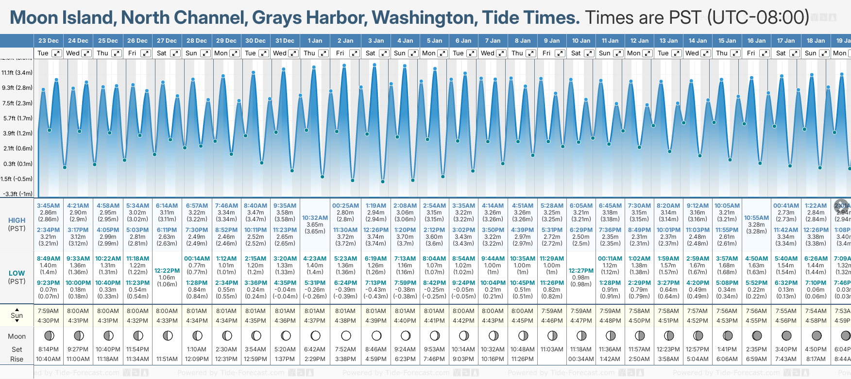 December and January Tide charts for Moon Island, North Channel, Grays Harbor: The tide charts below show the height, time and date of high and low tides for the next 30 days.