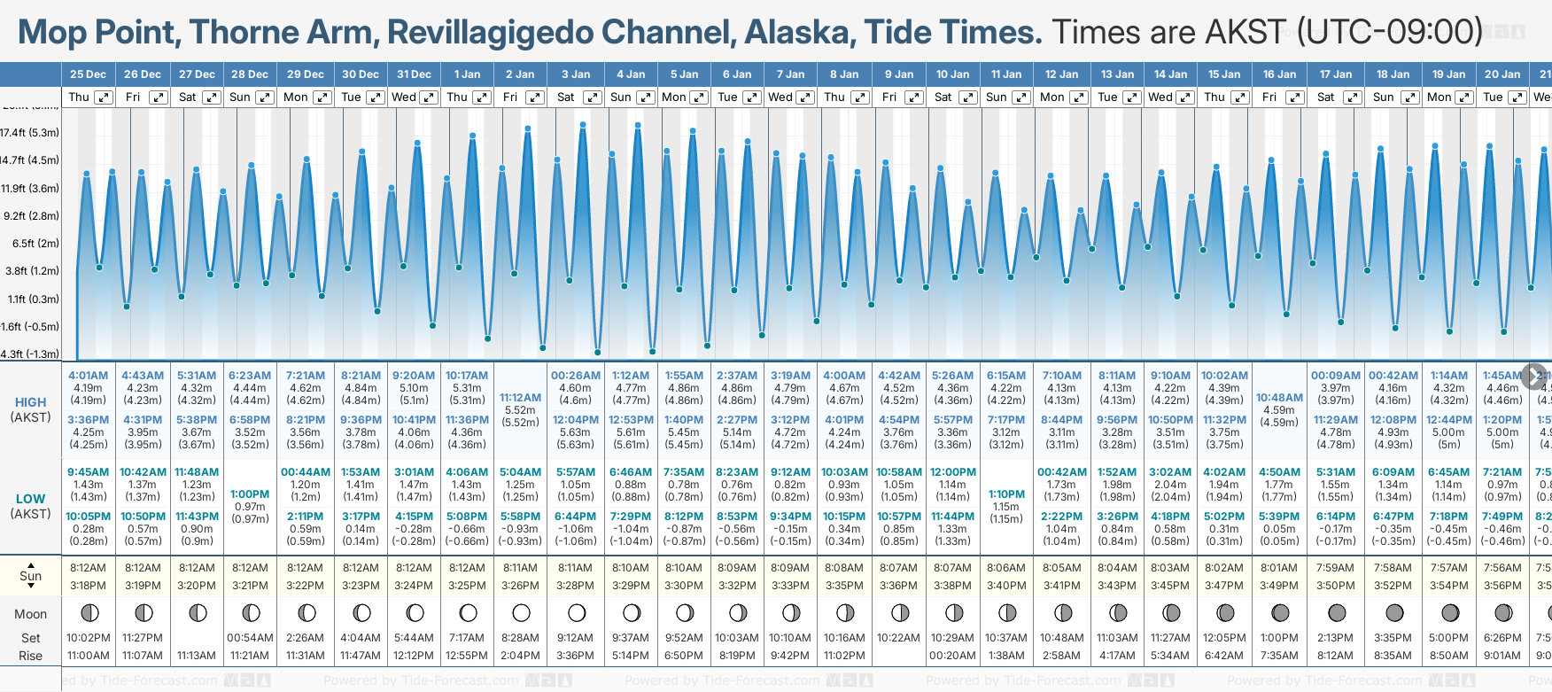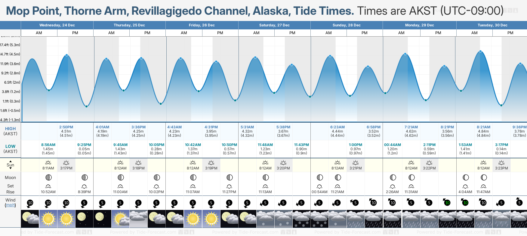 Tide chart for Mop Point, Thorne Arm, Revillagigedo ChannelShowing low and high tide times for the next 30 days at Mop Point, Thorne Arm, Revillagigedo Channel. Tide Times are AKST (UTC -9.0hrs).