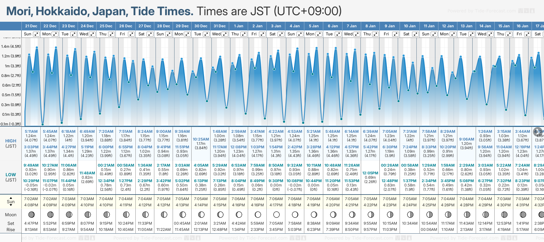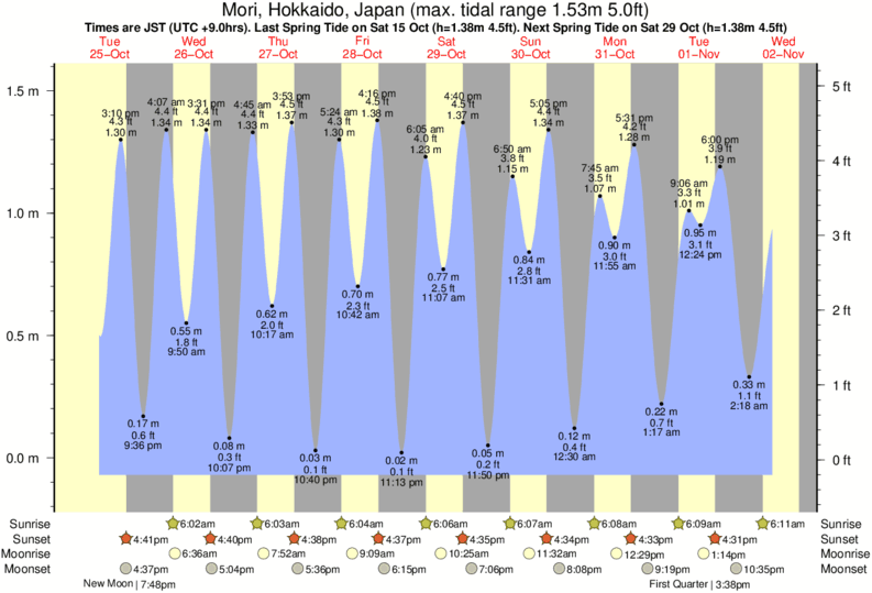 Tide Times are JST (UTC +9.0hrs). Last Spring High Tide at Mori was on Mon 08 Dec (height: 1.38m 4.5ft). Next high Spring Tide at Mori will be on Mon 22 Dec (height: 1.37m 4.5ft).