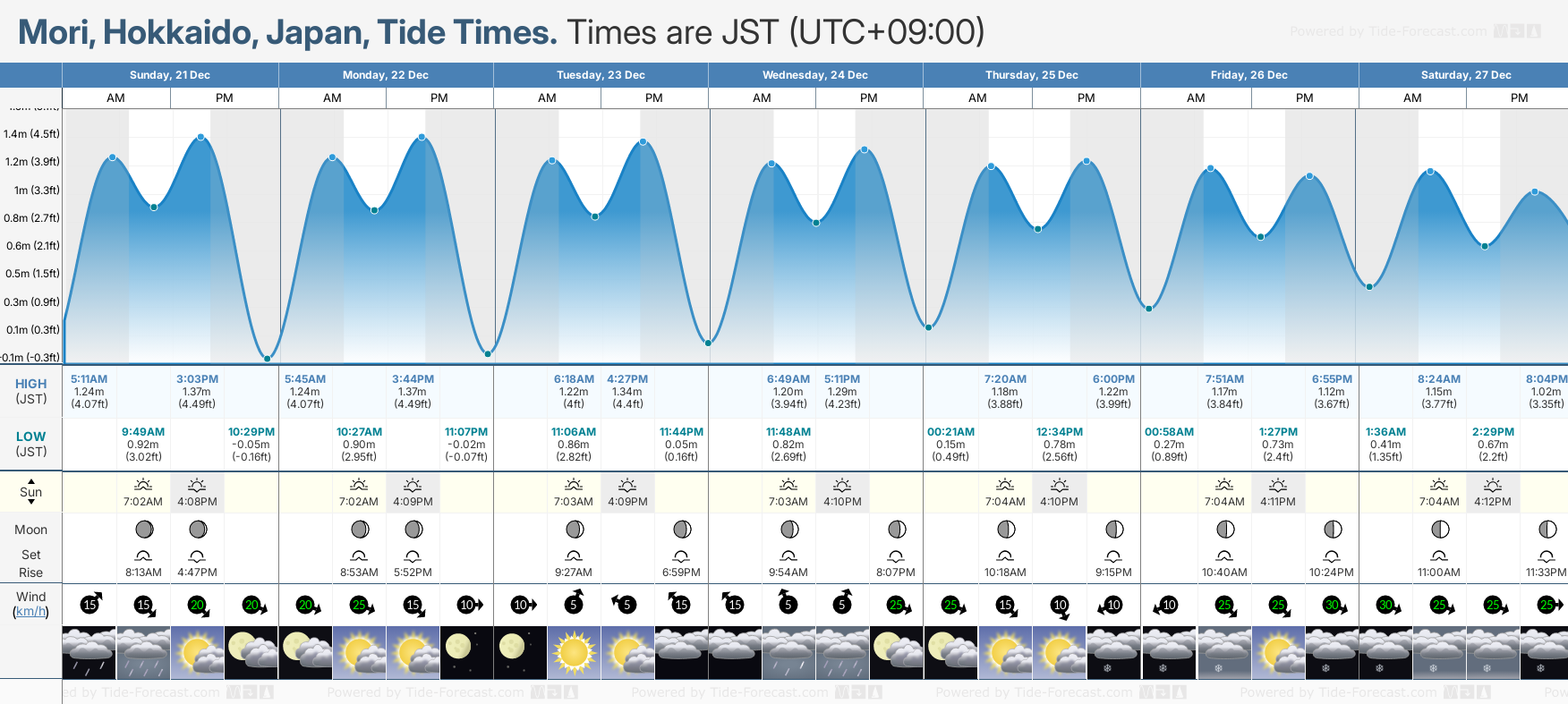 December and January Tide charts for Mori: The tide charts below show the height, time and date of high and low tides for the next 30 days.