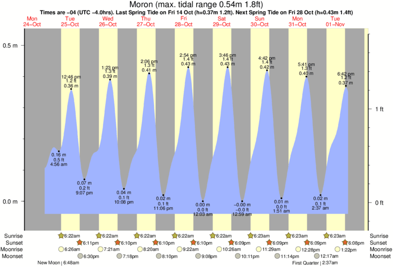Tide Times are -04 (UTC -4.0hrs). Last Spring High Tide at Moron was on Fri 05 Dec (height: 0.48m 1.6ft). Next high Spring Tide at Moron will be on Sat 20 Dec (height: 0.40m 1.3ft).