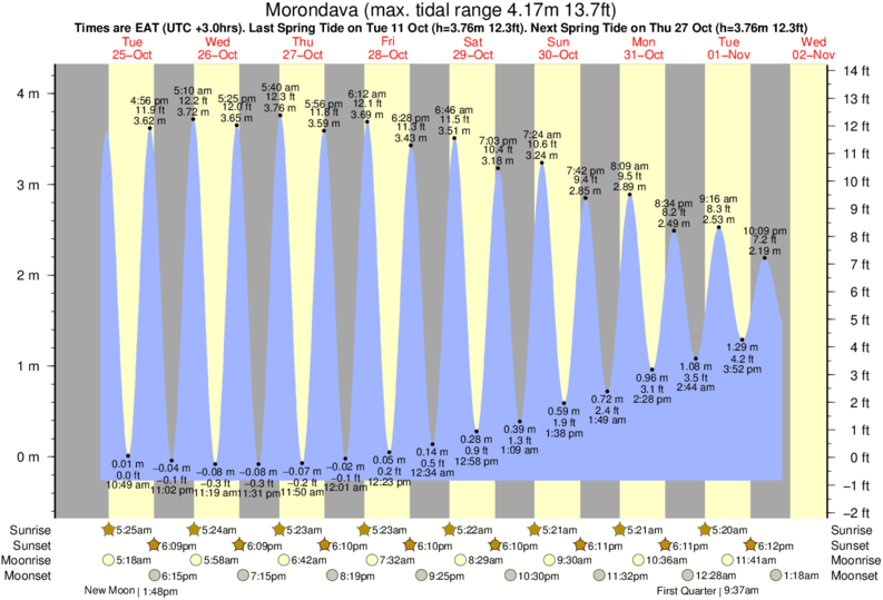 Tide chart for MorondavaShowing low and high tide times for the next 30 days at Morondava. Tide Times are EAT (UTC +3.0hrs).