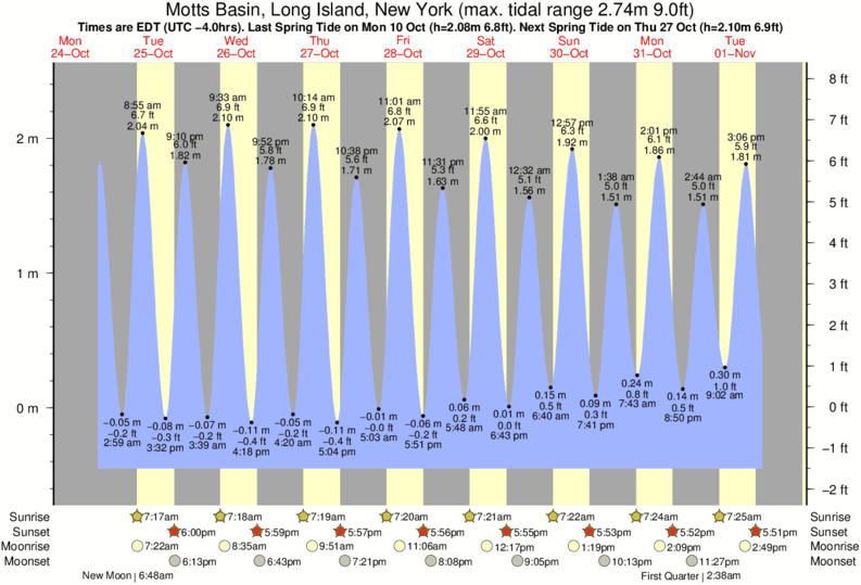 Tide Times are EST (UTC -5.0hrs). Last Spring High Tide at Motts Basin, Long Island was on Fri 19 Dec (height: 1.80m 5.9ft). Next high Spring Tide at Motts Basin, Long Island will be on Sat 03 Jan (height: 2.09m 6.9ft).