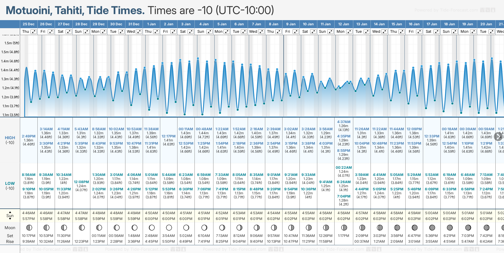 Tide Times are -10 (UTC -10.0hrs). Last Spring High Tide at Motuoini was on Mon 22 Dec (height: 1.41m 4.6ft). Next high Spring Tide at Motuoini will be on Sat 03 Jan (height: 1.44m 4.7ft).