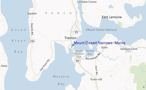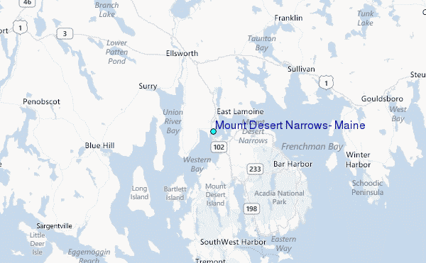 Use this relief map to navigate to tide stations, surf breaks and cities that are in the area of Mount Desert Narrows, Maine.