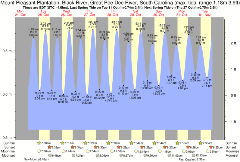 Tide chart for Mount Pleasant Plantation, Black River, Great Pee Dee RiverShowing low and high tide times for the next 30 days at Mount Pleasant Plantation, Black River, Great Pee Dee River. Tide Times are EST (UTC -5.0hrs).