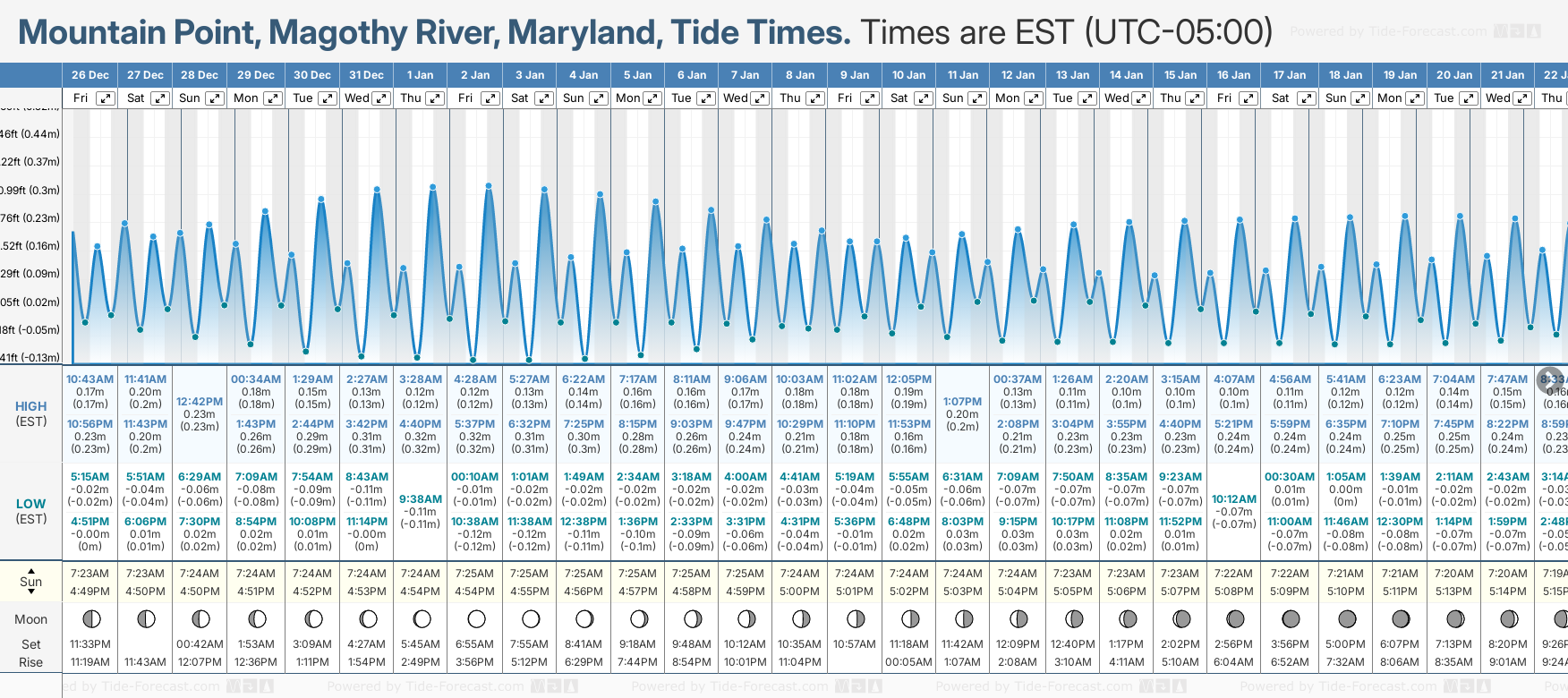 December and January Tide charts for Mountain Point, Magothy River: The tide charts below show the height, time and date of high and low tides for the next 30 days.