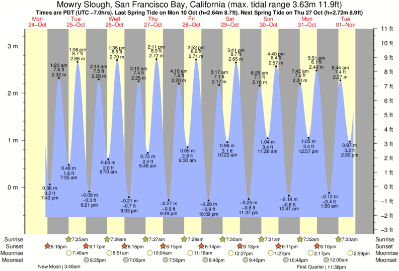 Tide Times are PST (UTC -8.0hrs). Last Spring High Tide at Mowry Slough, San Francisco Bay was on Fri 19 Dec (height: 2.66m 8.7ft). Next high Spring Tide at Mowry Slough, San Francisco Bay will be on Fri 02 Jan (height: 2.97m 9.7ft).