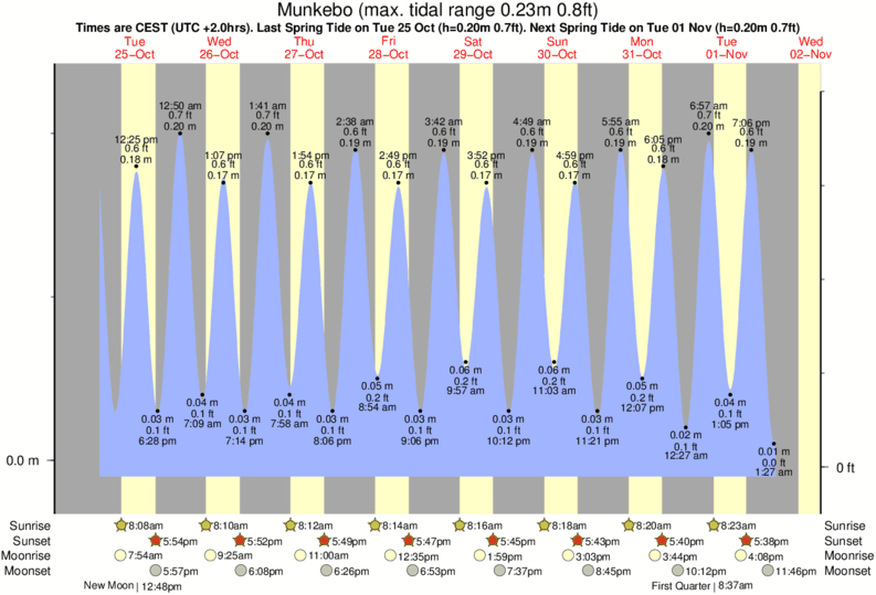 Tide Times are CET (UTC +1.0hrs). Last Spring High Tide at Munkebo was on Fri 19 Dec (height: 0.22m 0.7ft). Next high Spring Tide at Munkebo will be on Sat 03 Jan (height: 0.23m 0.8ft).