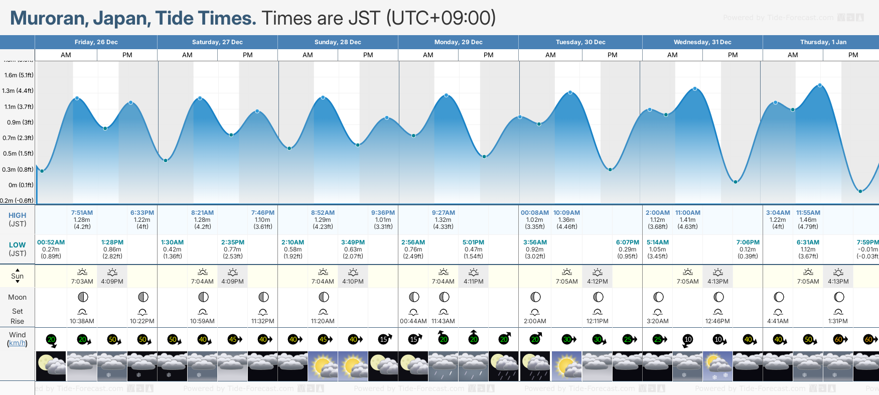 Tide Times are JST (UTC +9.0hrs). Last Spring High Tide at Muroran was on Mon 22 Dec (height: 1.49m 4.9ft). Next high Spring Tide at Muroran will be on Sun 04 Jan (height: 1.60m 5.2ft).