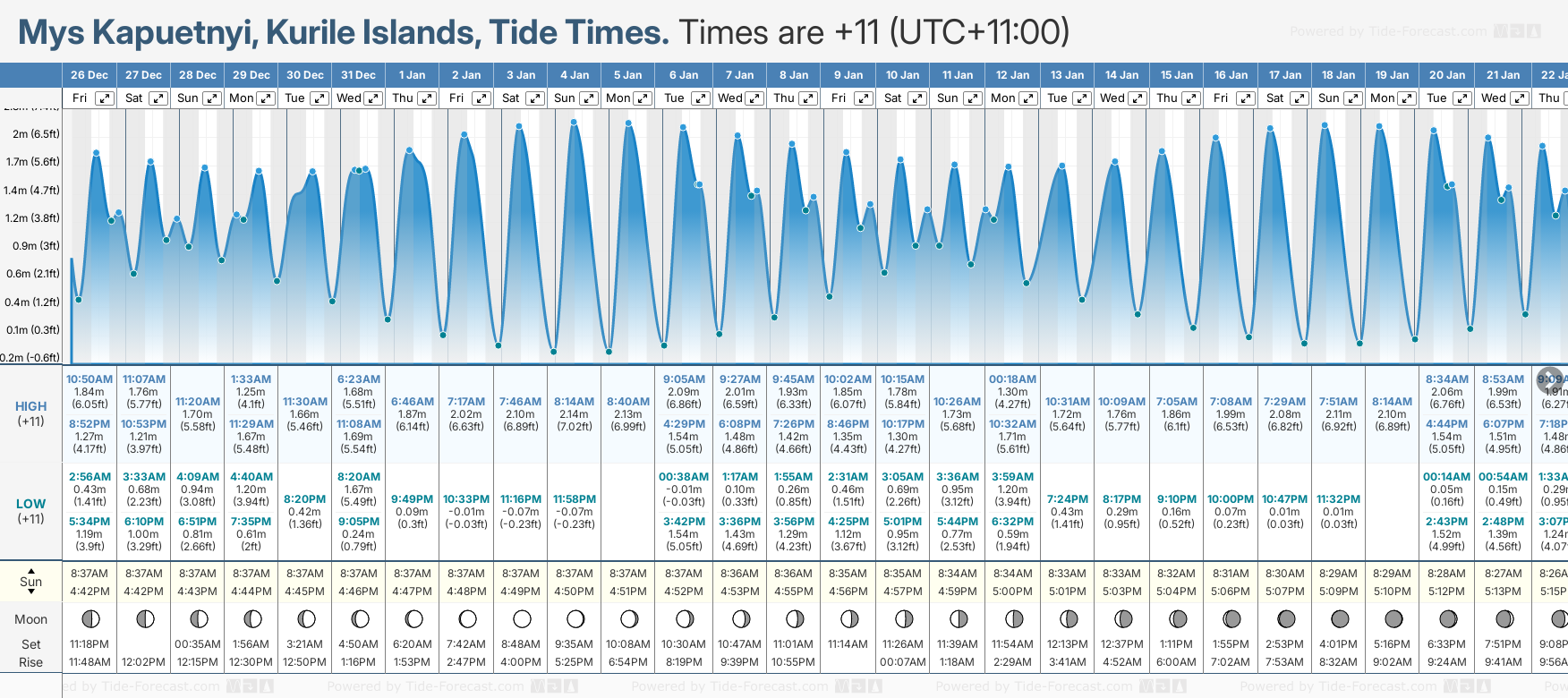 December and January Tide charts for Mys Kapuetnyi: The tide charts below show the height, time and date of high and low tides for the next 30 days.