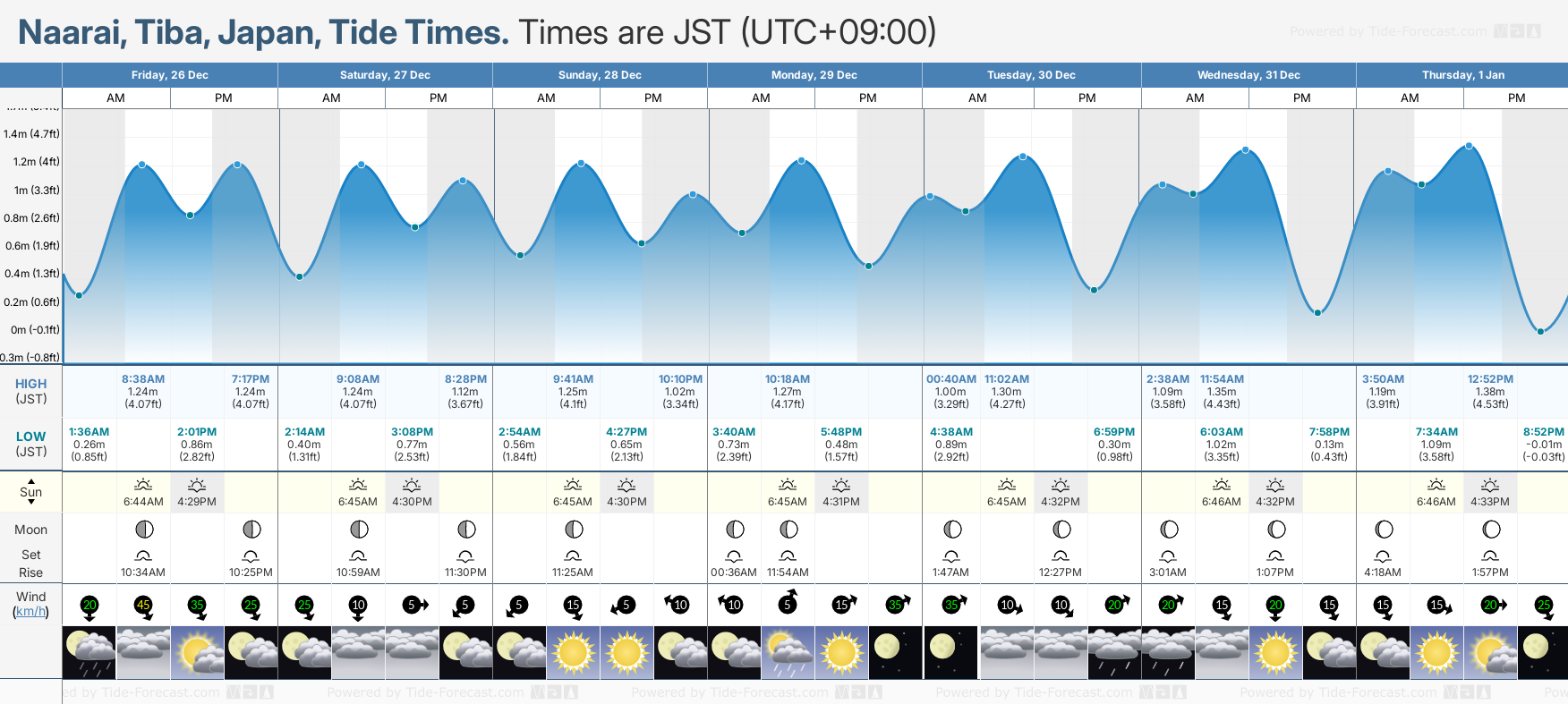 Tide Times are JST (UTC +9.0hrs). Last Spring High Tide at Naarai was on Tue 23 Dec (height: 1.45m 4.8ft). Next high Spring Tide at Naarai will be on Mon 05 Jan (height: 1.50m 4.9ft).