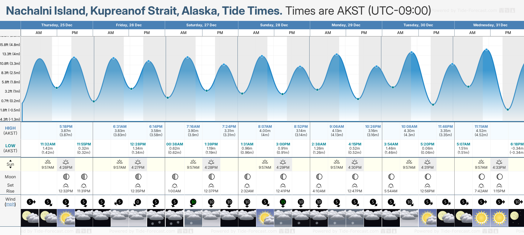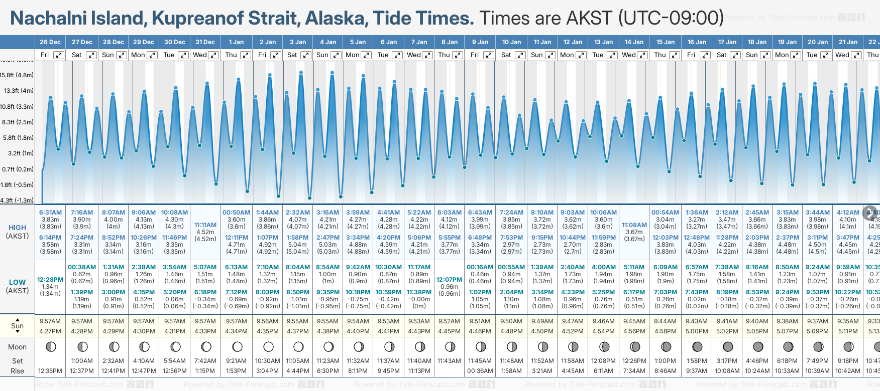 December and January Tide charts for Nachalni Island, Kupreanof Strait: The tide charts below show the height, time and date of high and low tides for the next 30 days.