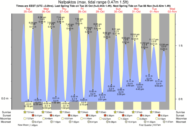 Tide Times are EET (UTC +2.0hrs). Last Spring High Tide at Nafpaktos was on Fri 05 Dec (height: 0.43m 1.4ft). Next high Spring Tide at Nafpaktos will be on Sun 21 Dec (height: 0.40m 1.3ft).