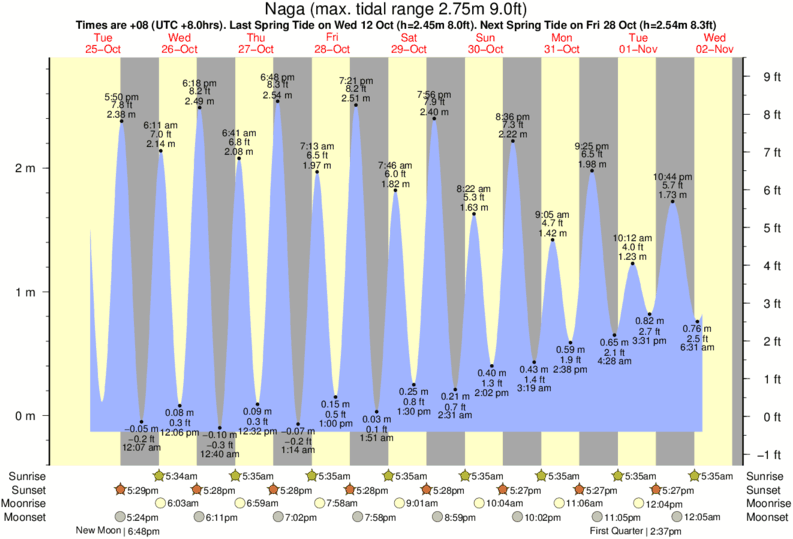Tide Times are PST (UTC +8.0hrs). Last Spring High Tide at Naga was on Sun 07 Dec (height: 2.61m 8.6ft). Next high Spring Tide at Naga will be on Mon 22 Dec (height: 2.32m 7.6ft).