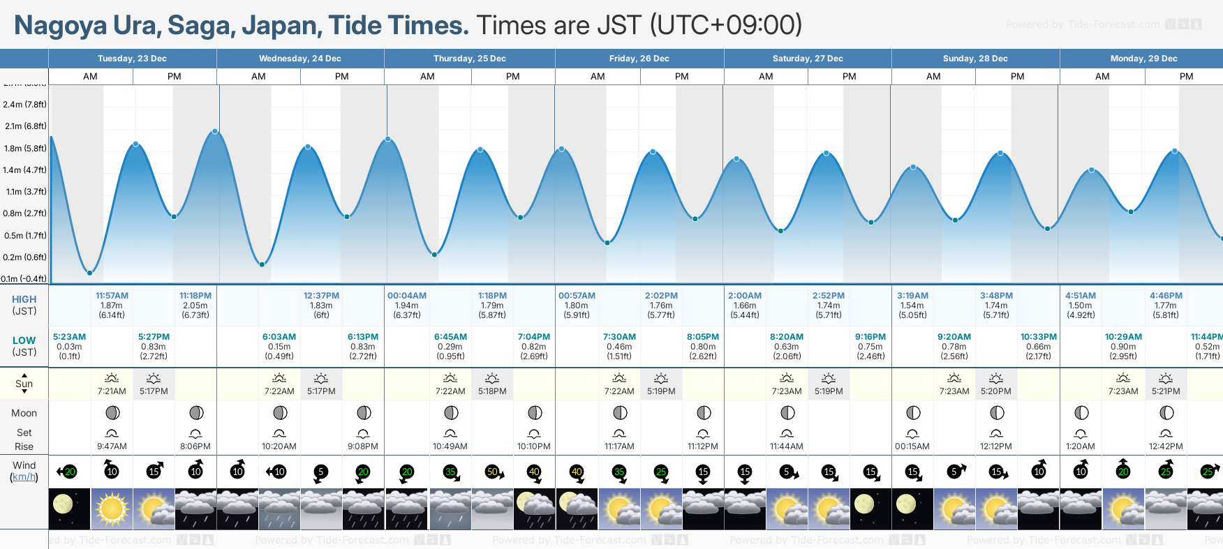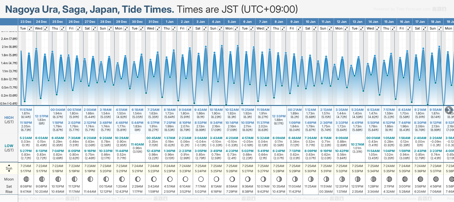 December and January Tide charts for Nagoya Ura: The tide charts below show the height, time and date of high and low tides for the next 30 days.