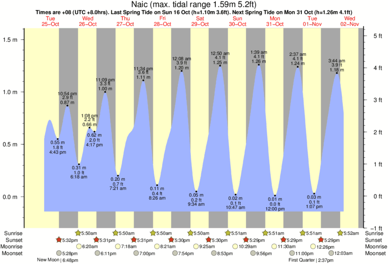 Tide chart for NaicShowing low and high tide times for the next 30 days at Naic. Tide Times are PST (UTC +8.0hrs).