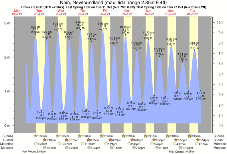 Tide Times are NST (UTC -3.5hrs). Last Spring High Tide at Nain was on Sat 06 Dec (height: 2.93m 9.6ft). Next high Spring Tide at Nain will be on Sun 21 Dec (height: 2.60m 8.5ft).