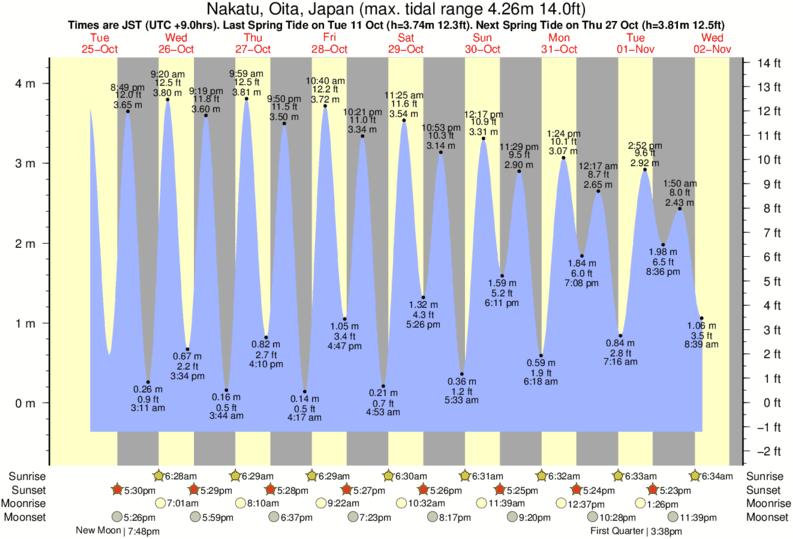Nakatu tide chart key: The tide chart above shows the height and times of high tide and low tide for Nakatu, Oita, Japan. The grey shading corresponds to nighttime hours between sunset and sunrise at Nakatu.