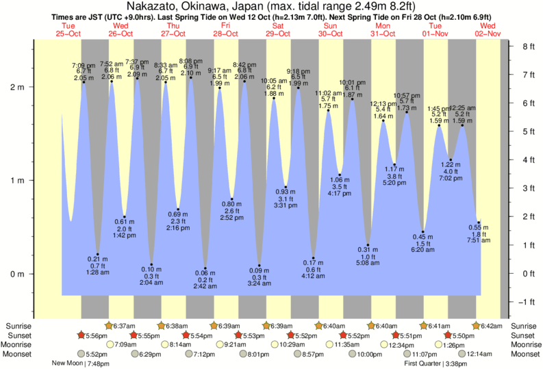 Nakazato tide chart key: The tide chart above shows the height and times of high tide and low tide for Nakazato, Okinawa, Japan. The grey shading corresponds to nighttime hours between sunset and sunrise at Nakazato.