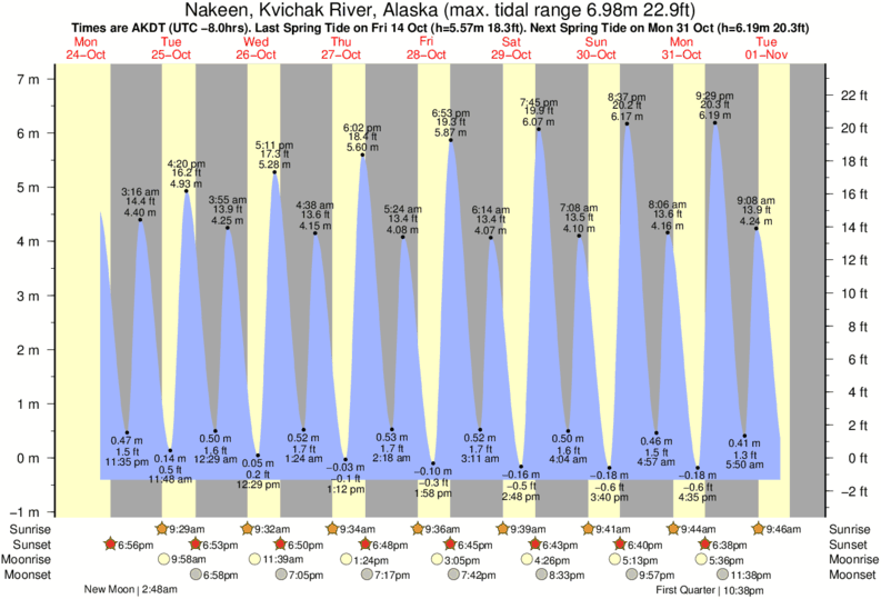 December and January Tide charts for Nakeen, Kvichak River: The tide charts below show the height, time and date of high and low tides for the next 30 days.