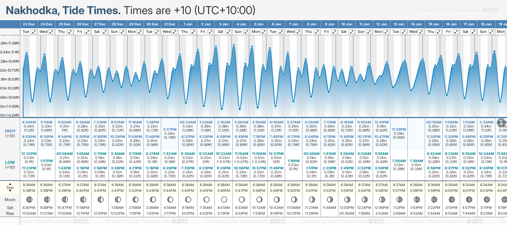 December and January Tide charts for Nakhodka: The tide charts below show the height, time and date of high and low tides for the next 30 days.