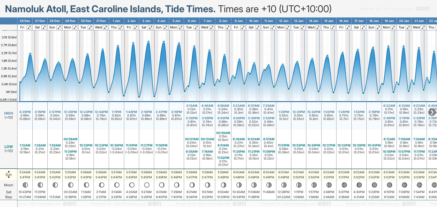 December and January Tide charts for Namoluk Atoll: The tide charts below show the height, time and date of high and low tides for the next 30 days.