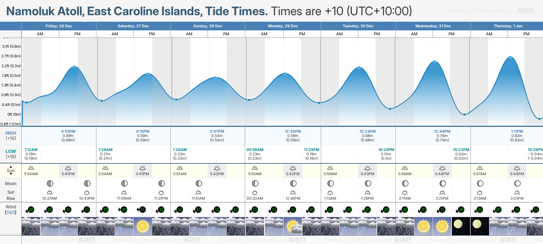 Tide chart for Namoluk AtollShowing low and high tide times for the next 30 days at Namoluk Atoll. Tide Times are +10 (UTC +10.0hrs).