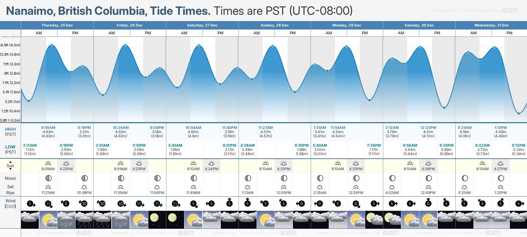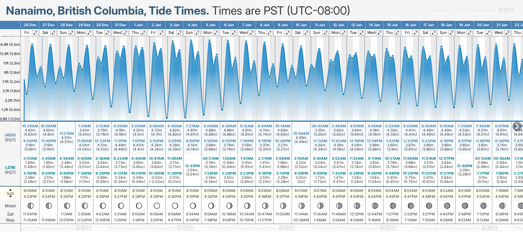 December and January Tide charts for Nanaimo: The tide charts below show the height, time and date of high and low tides for the next 30 days.
