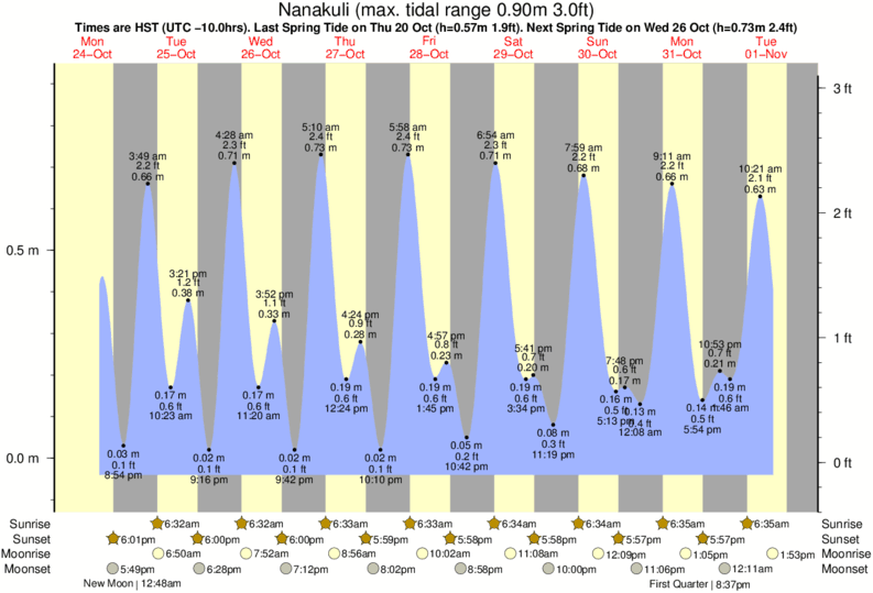 Tide Times are HST (UTC -10.0hrs). Last Spring High Tide at Nanakuli was on Fri 19 Dec (height: 0.74m 2.4ft). Next high Spring Tide at Nanakuli will be on Thu 01 Jan (height: 0.85m 2.8ft).