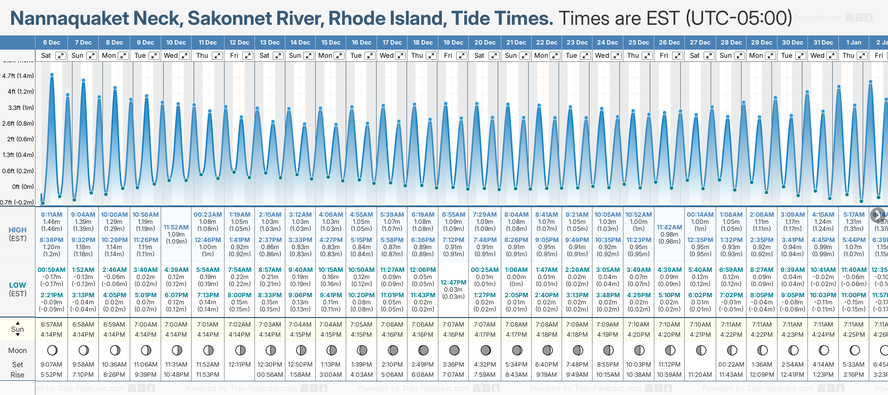 Tide chart for Nannaquaket Neck, Sakonnet RiverShowing low and high tide times for the next 30 days at Nannaquaket Neck, Sakonnet River. Tide Times are EST (UTC -5.0hrs).
