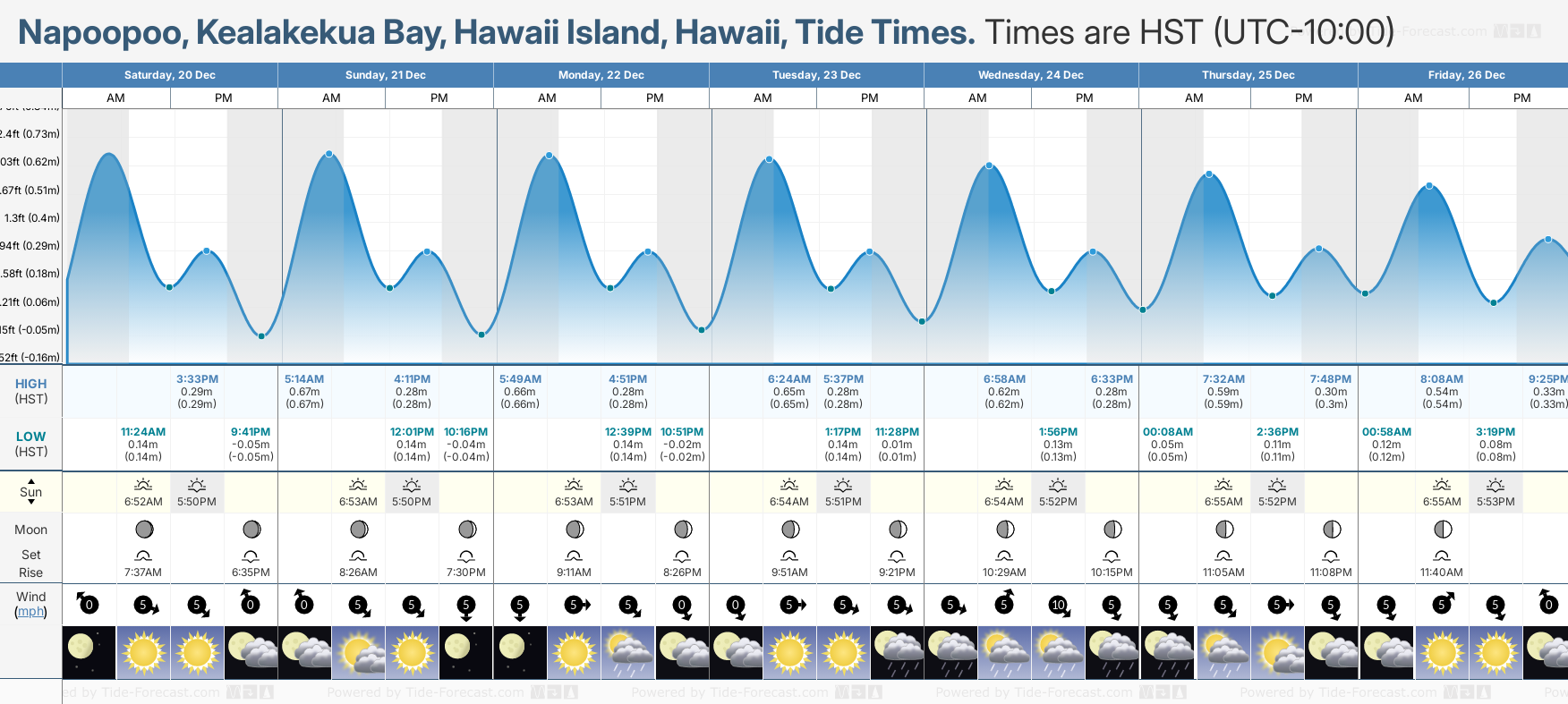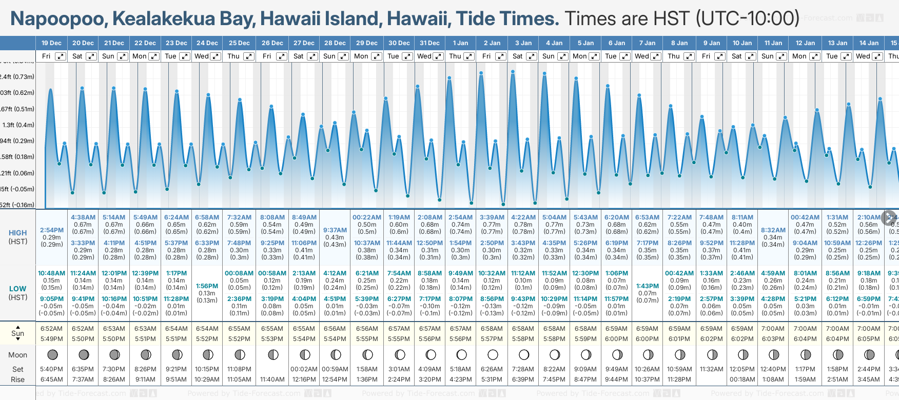 December and January Tide charts for Napoopoo, Kealakekua Bay Island: The tide charts below show the height, time and date of high and low tides for the next 30 days.