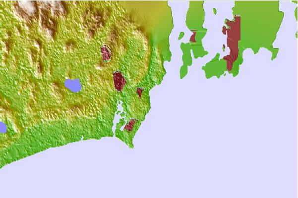 Use this relief map to navigate to tide stations, surf breaks and cities that are in the area of Narragansett Pier, Narragansett Bay, Rhode Island.