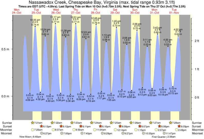 Tide Times are EST (UTC -5.0hrs). Last Spring High Tide at Nassawadox Creek, Chesapeake Bay was on Fri 05 Dec (height: 0.75m 2.5ft). Next high Spring Tide at Nassawadox Creek, Chesapeake Bay will be on Sun 21 Dec (height: 0.60m 2.0ft).