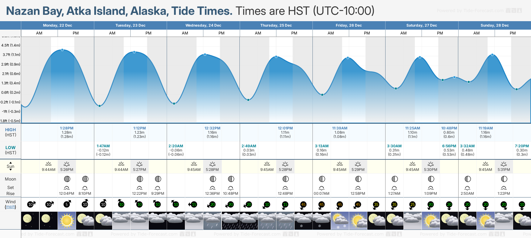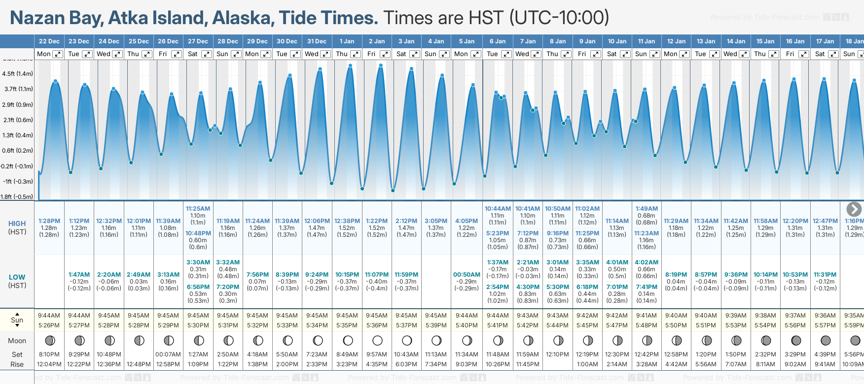 December and January Tide charts for Nazan Bay, Atka Island: The tide charts below show the height, time and date of high and low tides for the next 30 days.