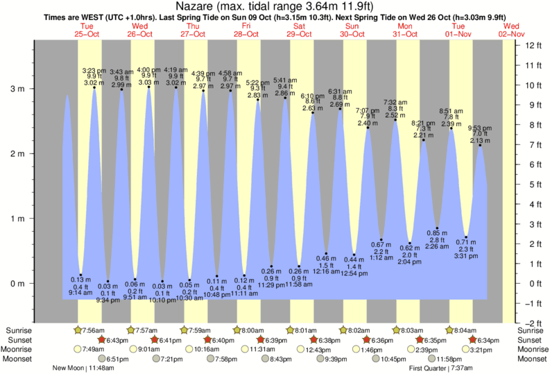 Tide Times are WET (UTC +0hrs). Last Spring High Tide at Nazare was on Sat 06 Dec (height: 3.15m 10.3ft). Next high Spring Tide at Nazare will be on Mon 22 Dec (height: 2.76m 9.1ft).