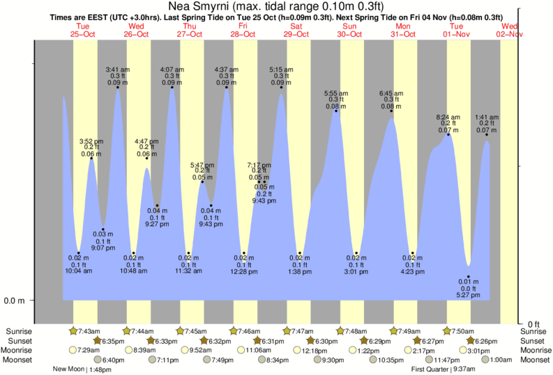 Tide Times are EET (UTC +2.0hrs). Last Spring High Tide at Nea Smyrni was on Sat 20 Dec (height: 0.09m 0.3ft). Next high Spring Tide at Nea Smyrni will be on Wed 31 Dec (height: 0.10m 0.3ft).