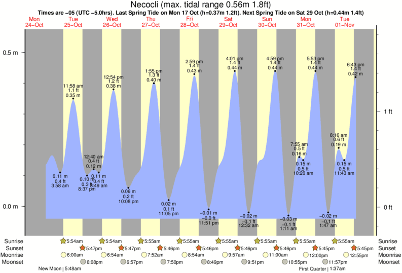 Tide Times are -05 (UTC -5.0hrs). Last Spring High Tide at Necocli was on Fri 05 Dec (height: 0.51m 1.7ft). Next high Spring Tide at Necocli will be on Thu 01 Jan (height: 0.52m 1.7ft).