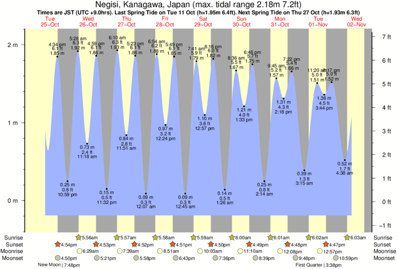 Tide Times are JST (UTC +9.0hrs). Last Spring High Tide at Negisi was on Sun 07 Dec (height: 1.83m 6.0ft). Next high Spring Tide at Negisi will be on Mon 22 Dec (height: 1.68m 5.5ft).