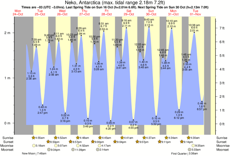 The tide chart above shows the height and times of high tide and low tide for Neko, Antarctica. The red flashing dot shows the tide time right now. The grey shading corresponds to nighttime hours between sunset and sunrise at Neko.